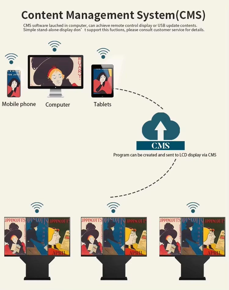 လမ်းပေါ်ရှိလမ်းသွားလမ်းလာများနှင့်မော်တော်ယာဉ်များအတွက် 75inch ကြီးမားသော 4K ကြော်ငြာမြှင့်တင်ရေးနှင့်သတင်းအချက်အလက်ပြသမှုကိုအကြံပြုထားသည်။ တစ်ချိန်တည်းမှာပင်နေ့စဉ်မြေပုံနှင့်သတင်းအချက်အလက်ရှာဖွေမှုကိုပေးနိုင်သည်